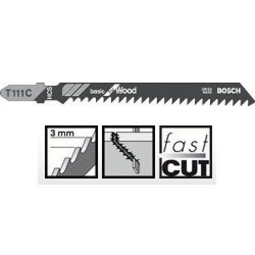 Пильне полотно Bosch Basic for Wood T 111 C із високовуглецевої сталі з фрезерованими зубами для швидкого товстого різання по прямій м'якій деревині, ДСП, ДВП, столярних плитах (10-50 мм).