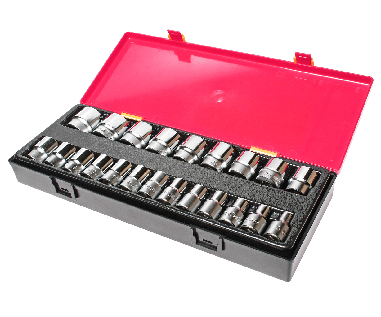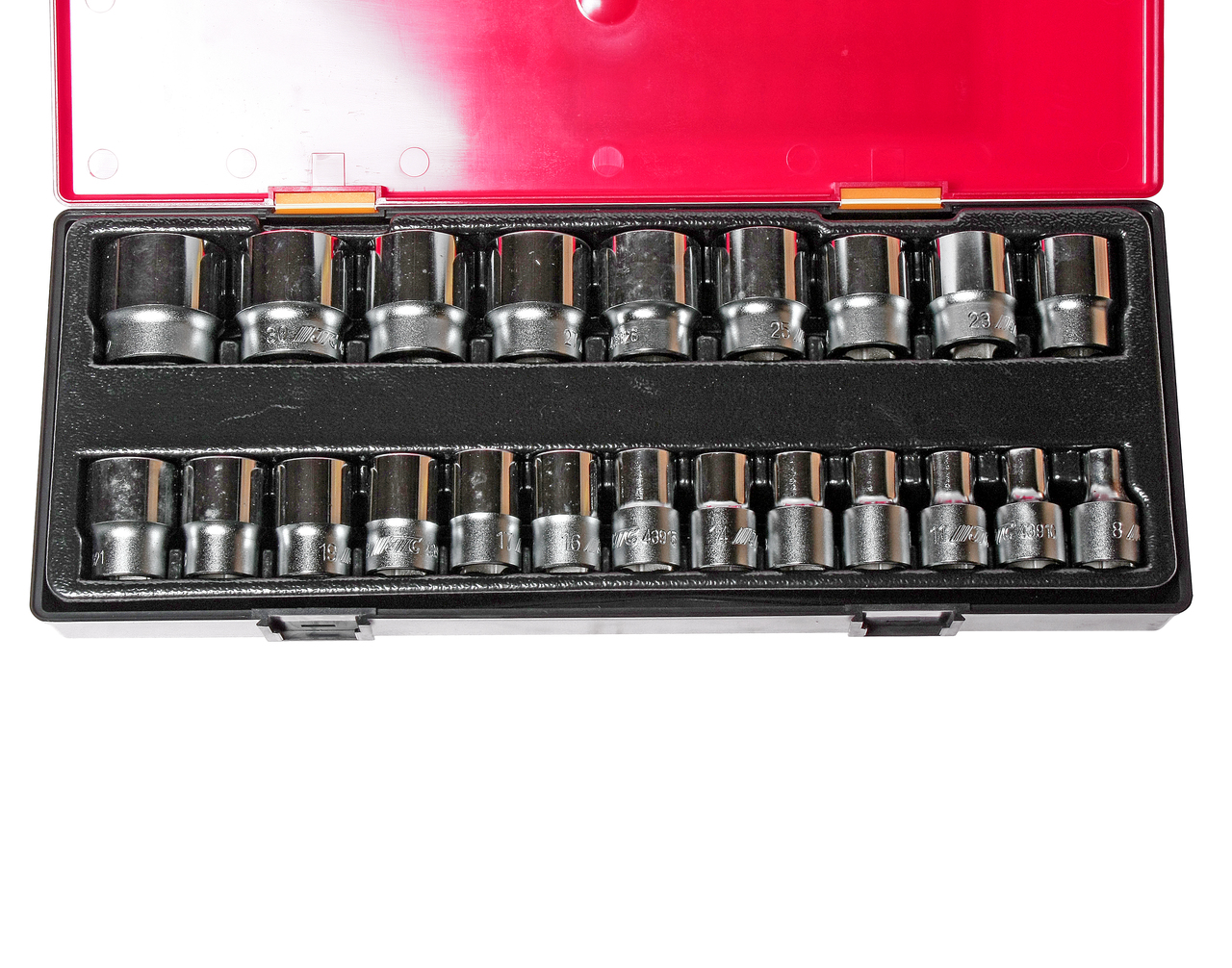 У комплекті: Артикули JTC-43908-32: 12-гранні: 8, 10, 11, 12, 13, 14, 15, 16, 17, 18, 19, 20, 21, 22, 23, 24, 25, 26 , 27, 29, 30, 32 мм. - 22 шт. Квадрат приєднання 1/2Загальна кількість предметів: 22 шт. Комплект упакований у міцний презентабельний бокс.