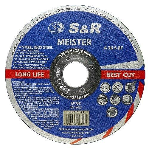 S&R Meister A 36 S BF - абразивне коло з подвійним армуванням, призначене для різання конструкційної сталі: легованої, нелегованої, високолегованої; для різання листової та нержавіючої сталі; для тонкостінних металевих профілів, а також можна застосовувати для роботи з чавуном, міддю, алюмінієм та його сплавами.