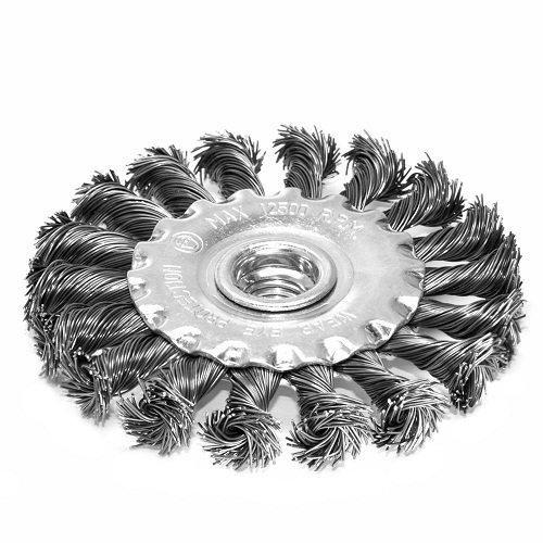 Щітка дискова S&R 100 мм для очищення металів або деревних матеріалів від різноманітних покриттів, корозії або забруднень, зачищення зварних швів. Призначена для використання з кутовими шліфувальними машинами при максимальній швидкості до 12500 об/хв.