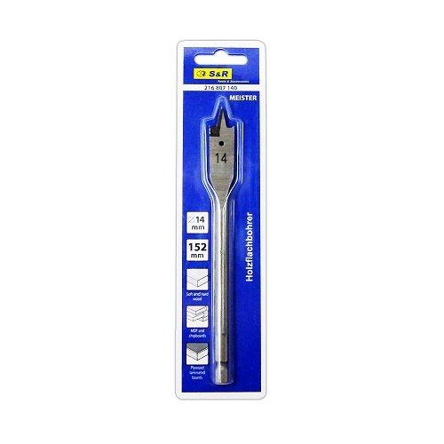 S&R 14x152 мм – пуховий свердло для свердління отворів у м'якій та твердій деревині, в гіпсокартоні, у ДСП та фанері.Свердло пуховий S&R призначений для роботи з дрилем та свердлильними установками. із високовуглецевої сталі, яка забезпечує високий ресурс свердлу для довгих годин роботи. Свердло обладнане хвостовиком HEX діаметром 7,5 мм. Плоска основа з центрувальним вістрям забезпечує якісне свердління отвору діаметром 14 мм.