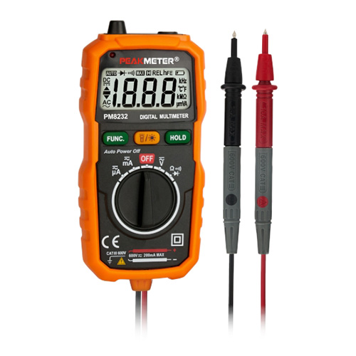 PM8232 цифровий мультиметр виробництва компанії PROTESTER. Мультиметр PM8232 дуже компактний, призначений для вимірювання напруги AC до 600 В/DC до 600В, струму AC/DC до 200мА, опору до 20 МОм. Живлення мультиметра здійснюється за допомогою 2-х батарей 1,5В типорозміру ААА, що є кращим, так як дані батареї недорогі і дуже поширені. На задній панелі мультиметра вбудований ліхтарик на основі надяскравого світлодіода – корисна функція у разі польового використання приладу. Особливості: Розширений діапазон вимірювання струму до 200мА Великий дисплей з яскравим підсвічуванням, 2000 відліків Вбудований ліхтарик, надяскравий світлодіод. Яскраве підсвічування для зручності роботи при недостатньому освітленні. Автоматичне відключення живлення для заощадження батарей.