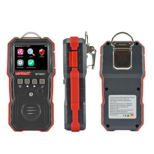 WT8801 – вимірювач концентрації горючих газів виробництва компанії Wintact. Вимірювач концентрації горючих газів WT8801 використовує високоякісний газовий датчик, що гарантує високу чутливість, точність та повторюваність вимірів. Відповідність стандартам: GB3836.1-2010 Вибухонебезпечні середовища. Частина 1. Загальні вимоги до устаткування. GB3836.4-2010 Вибухонебезпечні середовища. Частина 4. Устаткування з іскробезпечним захистом. GB15322.3-2003 Переносні детектори горючих газів, частина 3: Переносні детектори горючих газів з діапазоном вимірювання (0 ~ 100)% LEL. JJG693-2011 Стандарти перевірки для сигналізації виявлення горючих газів. Особливості детектора горючих газів WT8801: Кольоровий дисплей, дружній інтерфейс користувача Сигналізація небезпечних рівнів звукова / світлова / вібро Об'єм пам'яті 120 тис. записів