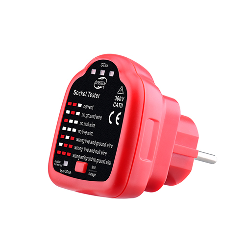 Benetech GT85 – професійний прилад для перевірки підключення фази, нуля та заземлення в розетці, а також перевірки спрацьовування ПЗВ шляхом створення навантаження 30 мА. Тестер для розеток Benetech GT85 надійний та простий у використанні, має міцний корпус та сучасний ергономічний дизайн. Невеликі габарити тестера забезпечують його мобільність. Пристрій оснащений світлодіодною індикацією правильності підключення контактів розетки та виготовлено відповідно до стандарту безпеки EN61010. Після включення до розетки у верхній частині тестера горітимуть від 0 до 3 світлодіодів, залежно від правильності підключення проводів у розетці. На передній панелі приладу вказані всі можливі комбінації світлодіодів: Все в порядку. Усі проводи підключені правильно У розетці відсутнє заземлення. У розетці немає нуль. У розетці відсутня фаза. Переплутані місцями фаза та заземлення. Переплутані місцями фаза та нуль. Фаза є як на своєму місці, так і на місці заземлення. Прилад призначений для перевірки розеток європейського типу із розташуванням фази з правого боку. Якщо тестер показує неправильне розташування фази, слід перевернути на 180° і включити назад. Також тестер GT85 має функцію тестування пристроїв захисного відключення (ПЗВ). Для перевірки ПЗВ потрібно натиснути кнопку тестера, при цьому він створить струм витоку 30 мА і пристрої захисного відключення повинні спрацювати. Коли кнопка затиснута, горітиме світлодіод, позначений RCD TEST. Клавішу не можна утримувати довше 3 секунд. Увага!!! Усі індикатори дають правильні показання лише за наявності в розетці заземлення. Для перевірки пристроїв захисного вимкнення обов'язково наявність заземлення.