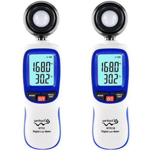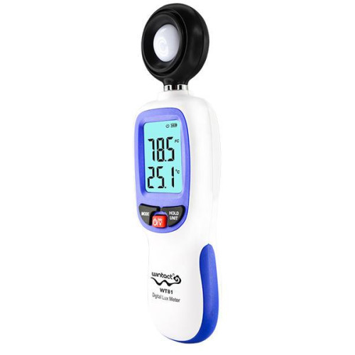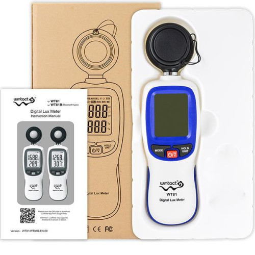 WT81B – новий цифровий люксметр виробництва компанії Wintact. Основним призначенням даного люксметра є вимірювання рівня освітленості та температури навколишнього середовища. Особливістю WT81B є: невеликі розміри приладу, висока чутливість фотодатчика та мале споживання (до 200 годин роботи). Діапазон виміру освітленості: до 200000 Lux, температури – від -9,9 до 49,9°С. Також WT81B оснащений функціями відображення мінімального та максимального значень вимірювання, автоматичного вимірювання, а для економії енергії батареї реалізована функція автоматичного вимикання приладу при тривалій бездіяльності. Надійну роботу люксметра забезпечує високочутливий кремнієвий фотодіод, як датчик рівня освітленості. Особливості люксметра WT81B: Вимірювання освітленості та температури. Висока чутливість та швидкість вимірювань. Яскраве підсвічування дисплея Функція відображення максимального, мінімального та середніх значень вимірювання Функція збереження результатів вимірювань Можливість вибору розмірності вимірювань: люкс або фут-кандела, °С або °F Можливість підключення через Bluetooth