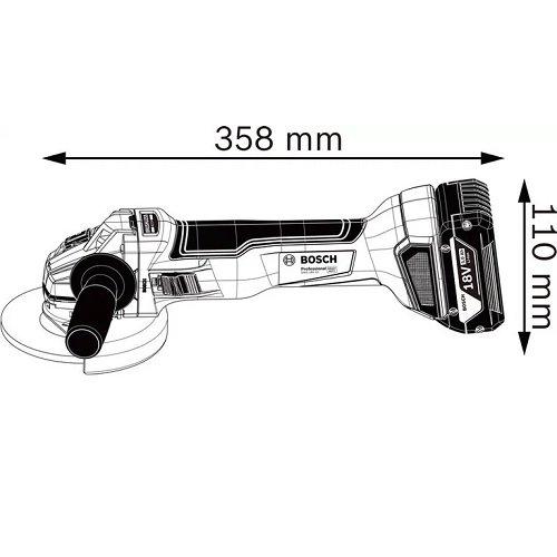 Кутова шліфувальна машина акумуляторна Bosch GWS 18V-10 (Li-ion 18 В) мала — невелика легка болгарка, яка має потужність еквівалентну мережному 1000 Вт інструменту. Її габарити 358х110 мм дозволяють працювати навіть у важкодоступних місцях.
