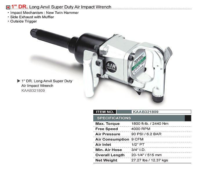 Пневмогайковерт TOPTUL KAAB321809 1" належить до класу потужних ударних пневматичних інструментів. Корпус гайковерта виконаний з композитного матеріалу і важить 12,37 кг. Пневмогайковерт виконаний з двома ручками для простоти управління. А так само для комфортної роботи кнопка пуску зовні на рукоятки. Максимальне зусилля створюване пневматичним гайковертом складає 2440 Н/м.