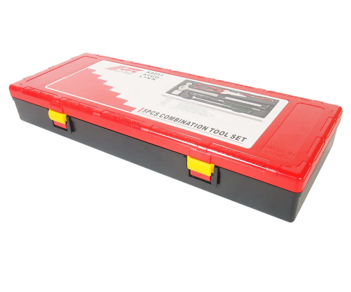 Опис У комплекті: JTC-3409: металевий молоток 1-1/2Р - 1 шт. JTC-3422А: ножиці 8-1 шт. JTC-3511: магнітний утримувач 3.5LBS - 1 шт. JTC-19387: торцева викрутка з гнучким стрижнем 7 мм. - 1 шт. JTC-2511: знімач для кліпс - 1 шт. Загальна кількість предметів: 5 шт. Комплект упакований у міцний презентабельний бокс. Габаритні розміри: 375/140/60 мм. (Д/Ш/В) Вага: 1910 гр.