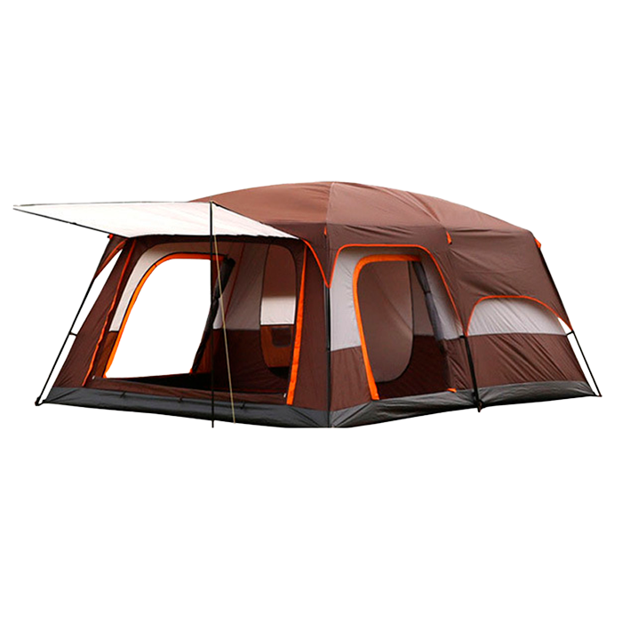 Имеет 2 комнаты, в каждой из которых может расположится для сна 3человека + тент для защиты от солнца и дождя.