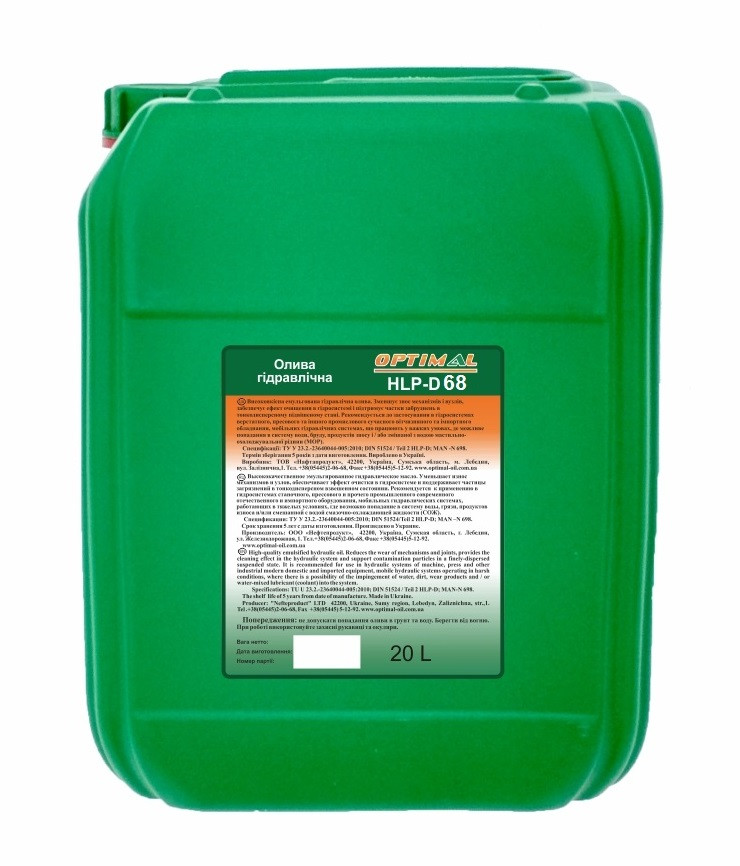 Гідравлічна олива HLP-D 68 - високоякісна емульгована, гідравлічна олива, яка зменшує зношення механізмів і вузлів, забезпечує ефект очищення в гідросистемі і підтримують частки забруднень в тонкодисперсном підвішеному стані. Олива надає комбінуючі детергируючі, змочуючі та диспергируючі властивості.