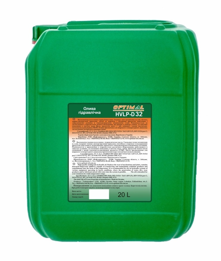 Гідравлічна олива HVLP-D 32 - високоякісна гідравлічна олива, що зменшує зношення механізмів і вузлів, забезпечує ефект очищення в гідросистемі і підтримують частки забруднень в тонкодисперсному підвішеному стані. Оливи містять миюче-диспергуючі присадки, здатні до переходу продуктів окислення і забруднюючих домішок у форму тонких дисперсій, суспензій і емульсій. Завдяки високій диспергируючій здатності даний продукт може застосовуватися в системах, в які може проникати вода, бруд і продукти зношування.