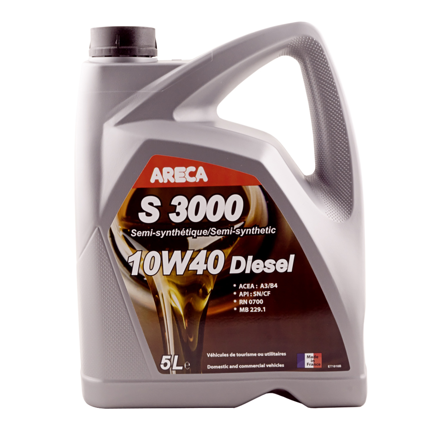 Areca S3000 Diesel, напівсинтетична моторна олія 10W40 - це моторна олія створена за абсолютно новою, пердовою рецептурою. Містить високоякісні синтетичні масла, і пакет присадок для важких умов експлуатації (посилені протизносні характеристики, високостабільний модифікатор в'язкості та мийно-диспергуючий комплекс). Напівсинтетична моторна олія 10W40 Areca S3000 Diesel адаптована для всіх сучасних дизельних двигунів з прямим упорскуванням високого тиску (з наддувом або без) легкових та малотоннажних автомобілів. Напівсинтетична моторна олія 10W40 Areca S3000 Diesel має допуск максимальної якості по API - SN, що дозволяє його використовувати у всіх корейських, японських та американських автомобілях, за винятком спецдопуску. Моторна олія 10W40 Areca S3000 Diesel ідеально підходить для використання в мікроавтобусах (особливо Mercedes-Benz та Renault) та легкових автомобілях з пробігом, особливо французького виробництва. Напівсинтетична моторна олія 10W40 Areca S3000 Diesel була розроблена спеціально з урахуванням зростаючих вимог останніх норм ACEA B4. Таким чином, воно рекомендується до застосування у всіх сучасних дизельних легкових транспортних засобах, що мають такі позначення: CDI, CDX, dCi, DDI, DTD, DTI, GDI, HDI, JTD, TDdi, Tdi, TiD. Переваги: Знижує ризики зносу, зменшує забруднення та забезпечує оптимальний захист двигуна. Задовольняє останнім вимогам, пов'язаним із дизельними двигунами з безпосереднім упорскуванням при високому тиску. В'язкі властивості, що забезпечують чудову плинність масла при низьких температурах, гарантують легкий запуск двигуна і негайну подачу масла до всіх деталей. Чудова в'язкість за високих температур гарантує стабільність масляної плівки. Термічна стабільність дозволяє використовувати олію цілий рік. Використання синтетичних базових масел, що дає слабку леткість олії. Вміст хлору нижче 50 ppm