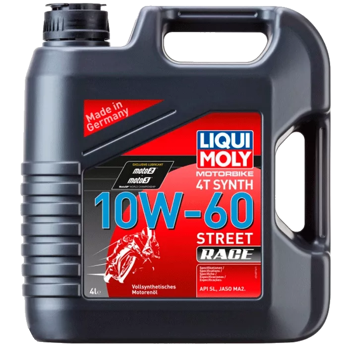 Racing Synth 4T 10W-60 — Синтетична моторна олива для 4-тактних мотоциклів Призначена для спортивного застосування. Апробовано у перегонах. Для оптимального змащування двигуна за високих навантажень на нього. Високі протизносні властивості. Для високонавантажених двигунів шосейних та спортивних мотоциклів. Забезпечує високу чистоту двигуна. Допуски та специфікації: API-SL, JASO MA-2