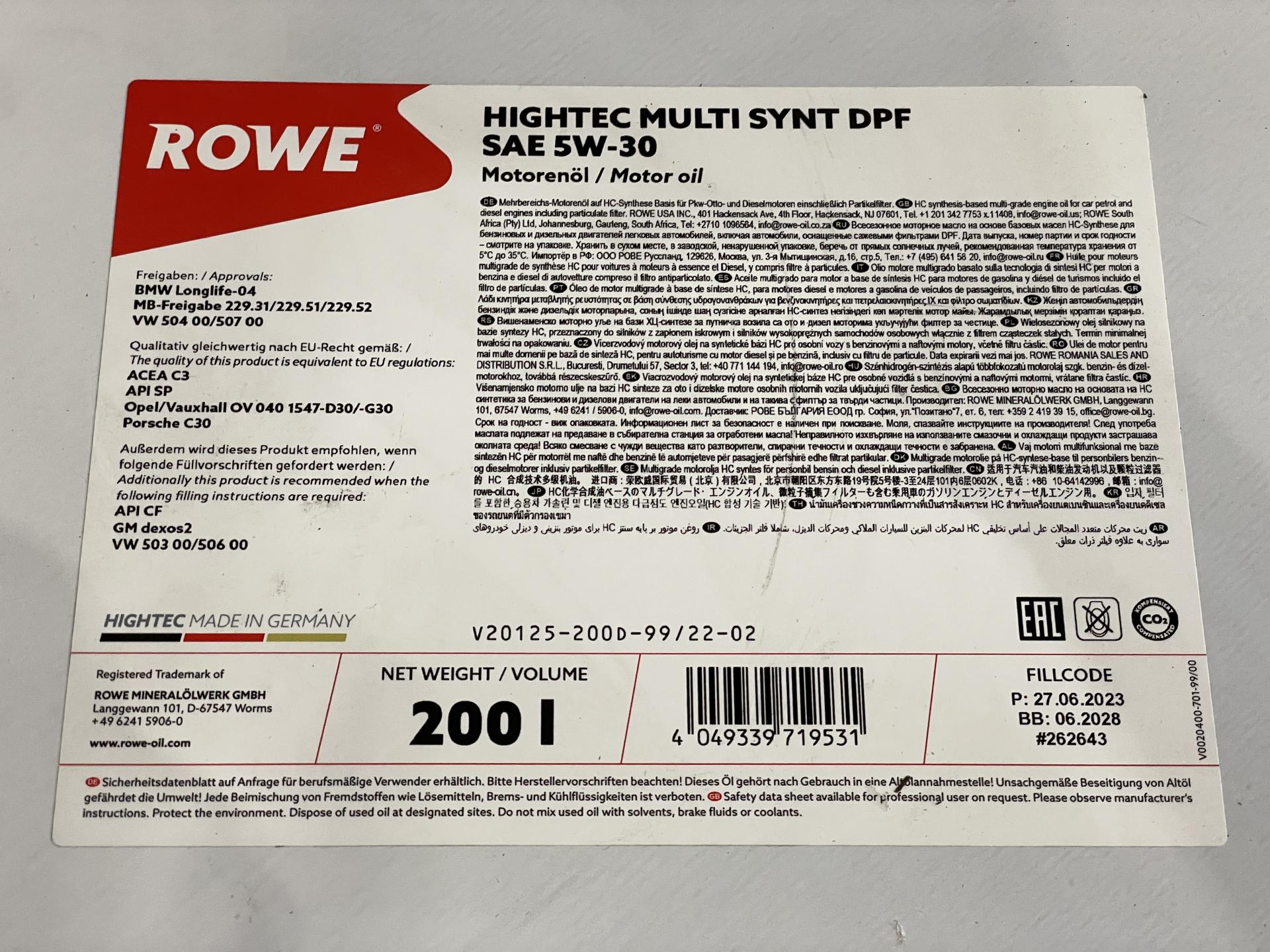 Олива моторна ROWE HIGHTEC MULTI SYNT DPF 5W-30 200л. 20125200D99