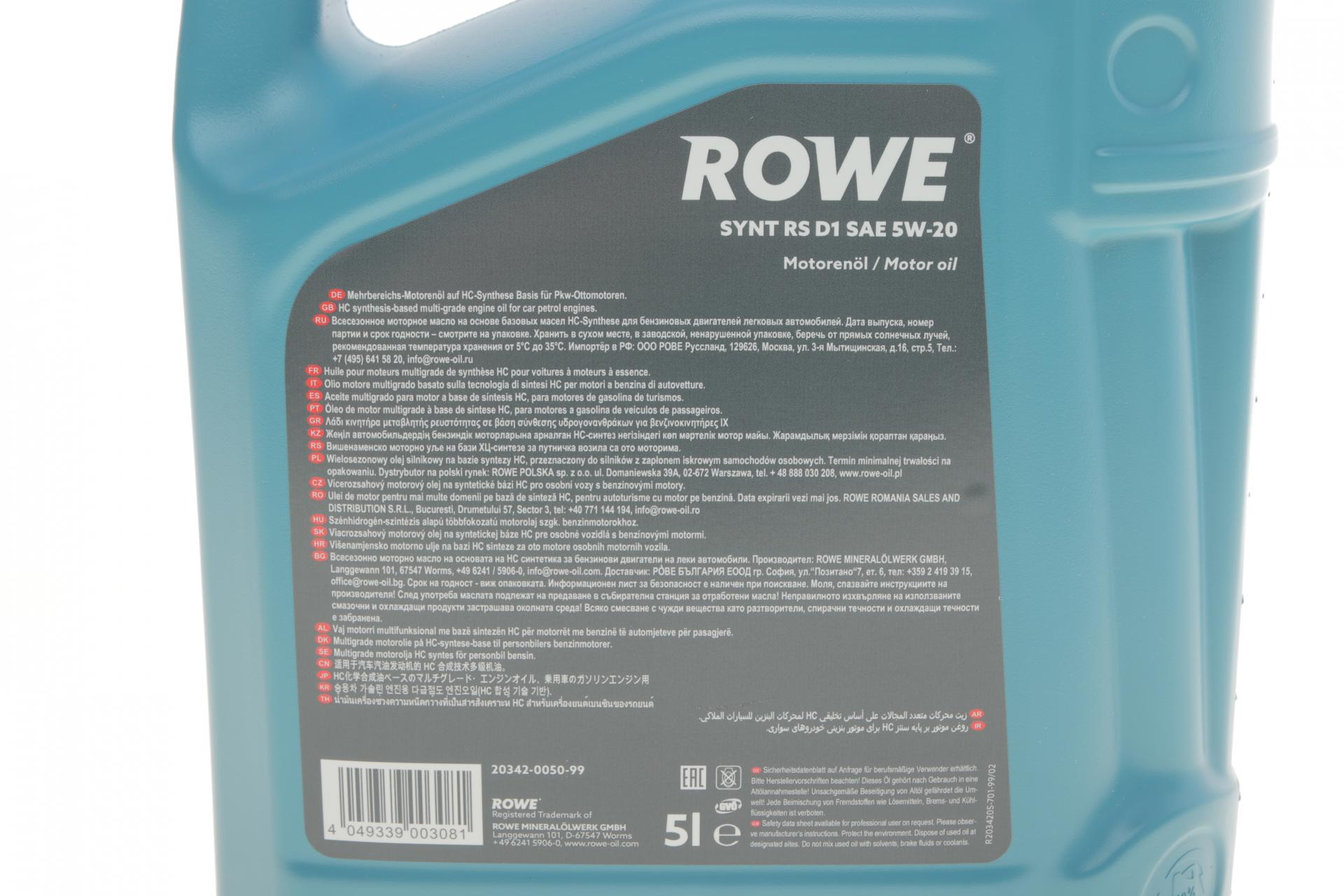Олива моторна ROWE HIGHTEC SYNT RS D1 5W-20 5л. 20342005099