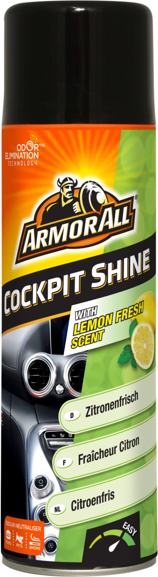 Armor All Cockpit Shine миттєво очищає, надає блиску та відновлює колір внутрішніх поверхонь автомобіля.