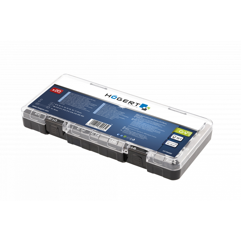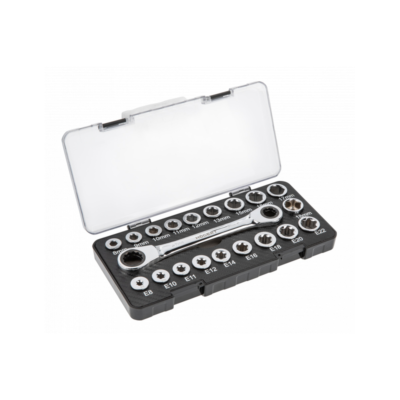Ключ із тріскачкою з набором головок використовується для відгвинчування та затягування різьбових з'єднань із шестигранним фіксуючим елементом та TORX. Завдяки храповику немає необхідності знімати ключ із гайки, щоб зробити ще один оборот, а насадки дозволяють працювати з гвинтами різних розмірів. Набір із 20 предметів дозволяє працювати в діапазоні від 8 до 19 мм / E8 – E22 мм. Універсальне застосування ключа дозволяє використовувати його як у майстерні, так і при ремонтних, будівельних та монтажних роботах.