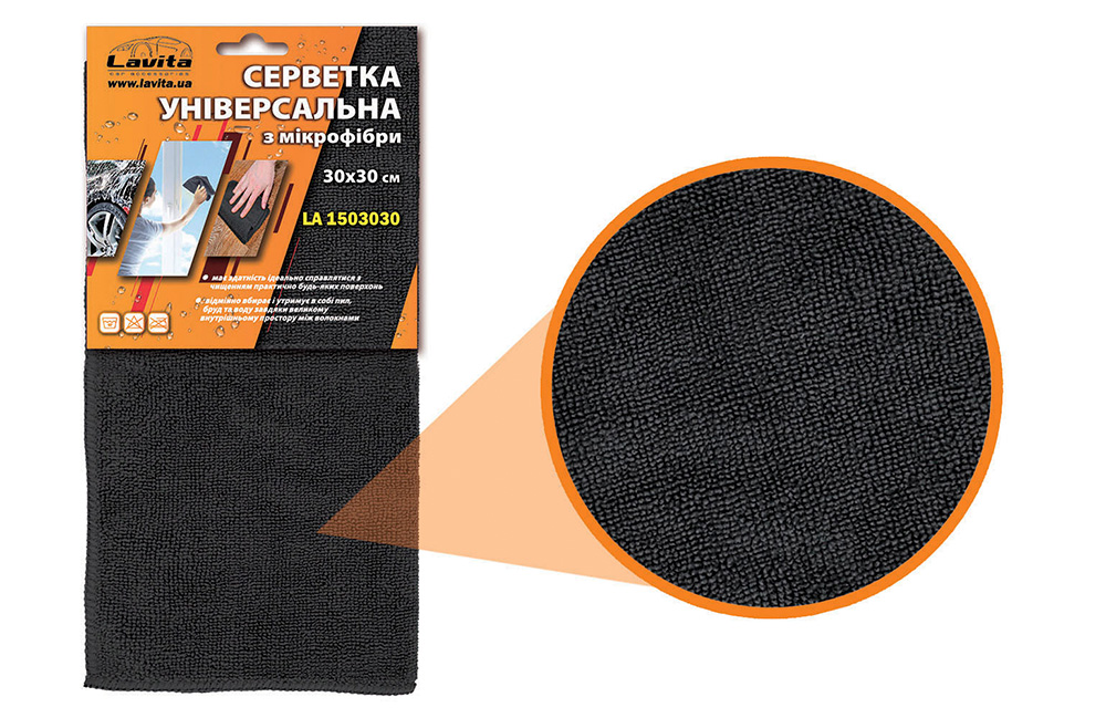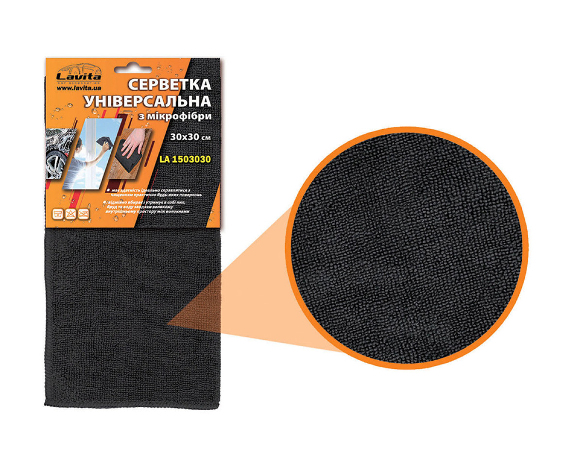 LA 1503030 Універсальна серветка з мікрофібри - це відмінний помічник в задачах догляду за інтер'єром та екстер'єром автомобіля, а також побутовою технікою, меблями, стеклами і дзеркалами. Відрізняється високими вологопоглинаючими властивостями і чудово підходить для сушки кузова і стекол автомобіля після мийки - серветка вбирає залишки води і гарантує ідеальну чистоту поверхонь без смуг, плям або розводів. Може застосовуватися для полірування кузова і нанесення воску - повністю сумісна з ними і покращує їх властивості, надає гарний глянсовий блиск покриттю і приховує його дефекти у вигляді подряпин або потертостей. Під час мийки серветка Lavita LA 1503030 вбирає в себе абразивні частинки забруднень і мінімізує їх негативний вплив, перешкоджаючи появі подряпин. Не залишає плям, смуг або ворсинок для максимальної чистоти поверхні.
