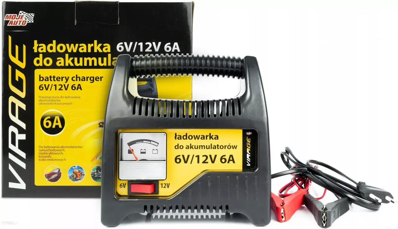 Зарядний пристрій для АКБ 6V/12V 6A VIRAGE 93-038. Для зарядки свинцево-кислотних акумуляторів автомобілів, мотоциклів, моторних човнів та аналогічних транспортних засобів. Не слід використовувати для заряджання нікель-кадмієвих акумуляторів або інших типів акумуляторів.